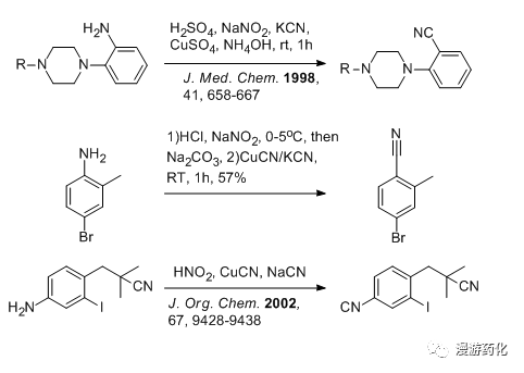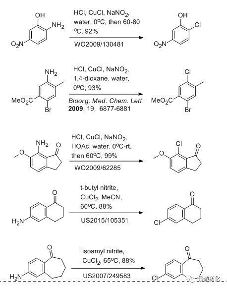 對(duì)于重氮鹽生成鹵代芳烴和腈基化合物的反應(yīng),其機(jī)理還沒有完全搞清楚,一般我們認(rèn)為是一個(gè)自由基反應(yīng),苯環(huán)上的取代基(如羥基,烷氧基,?;?,羧基,硝基和鹵素等),無論是吸電子基團(tuán)還是供電子基團(tuán),對(duì)反應(yīng)都沒有特別的影響,氯代必須用CuCl/HCl 體系,溴代則要用CuBr/HBr 體系,碘代則一般用鹽酸做重氮鹽,不用Cu 鹽催化,直接加KI或NaI 就能得到碘苯。