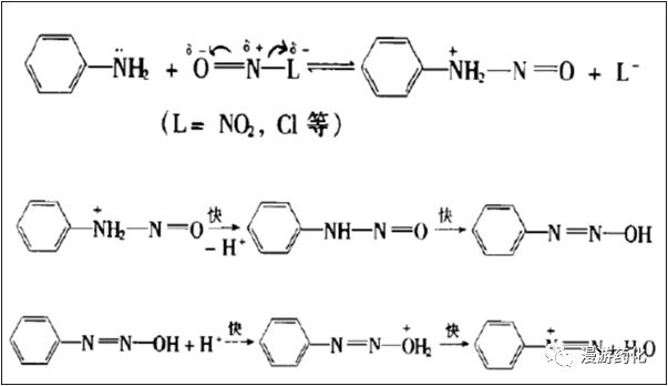 芳胺的重氮化反應(yīng)需經(jīng)2步,首先是親電試劑進(jìn)攻芳胺氮原子生成不穩(wěn)定的中間產(chǎn)物,然后不穩(wěn)定中間產(chǎn)物迅速分解,整個(gè)反應(yīng)受第一步控制。無機(jī)酸不同,參與重氮化反應(yīng)的親電試劑也不同。稀硫酸中參與反應(yīng)的是N2O3(一為不穩(wěn)定結(jié)構(gòu)ONONO,一為穩(wěn)定結(jié)構(gòu)ONNO2),鹽酸中參與反應(yīng)的是亞硝酰氯NOCl;在濃硫酸中則是亞硝基正離子N+O。他們的親電性強(qiáng)弱順序?yàn)? N+O>NOCl>N2O3