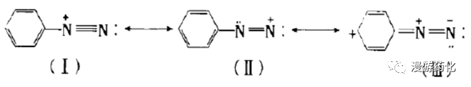 共振式(I)(II)可解釋重氮鹽有雙重反應(yīng)性能, (I)式表現(xiàn)易發(fā)生放氮的取代反應(yīng),(II)式作為重氮組分進(jìn)行偶合反應(yīng)。