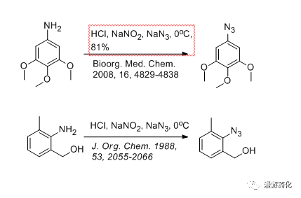 由于疊氮鈉是劇毒品,碰擊易炸,使用要小心。切忌敞口環(huán)境下與酸混合,否則生成劇毒的疊氮酸氣體。做此類反應(yīng),需要在密閉的體系中操作,其中一口用反扣的橡皮塞,最后把疊氮鈉溶于水中,用注射器推入到反應(yīng)體系中。反應(yīng)跟蹤時(shí),用注射器取樣,產(chǎn)物大多在LCMS上不出分子離子峰。TLC板跟蹤。